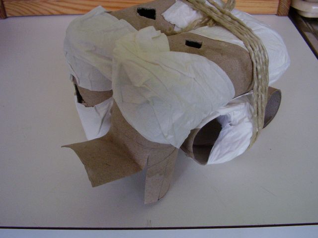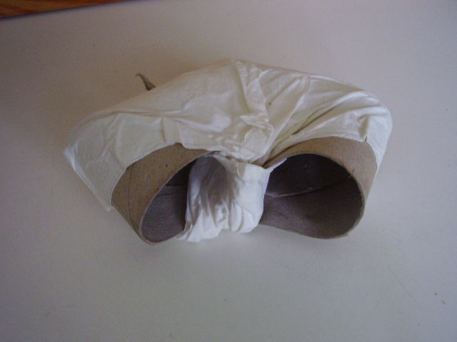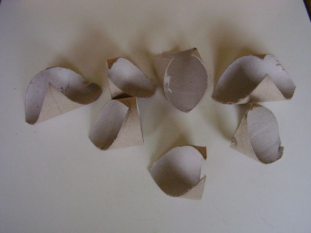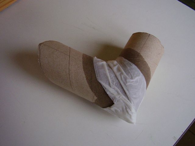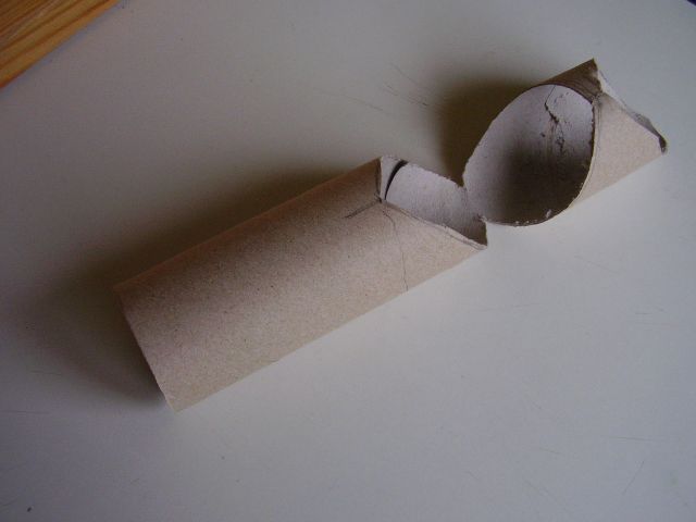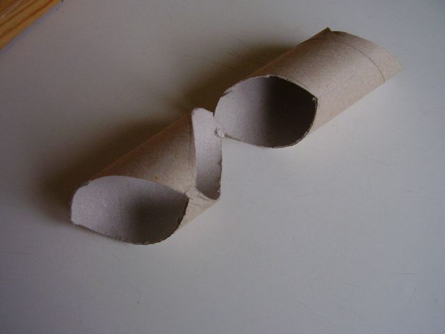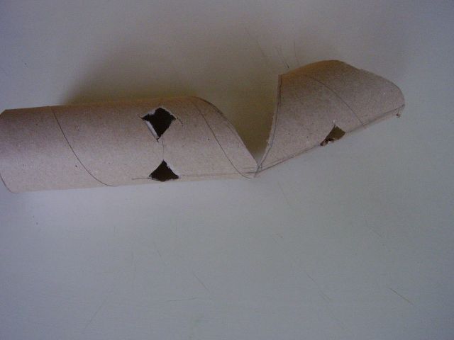 Podľa nášho plániku si najprv začneme vytvárať jednotlivé časti labyrintu. Zahnutia budúcich tunelov budeme robiť v pravom uhle. Na jeden labyrint používajme rolky toho istého rozmeru. Potom vytvorenie pravého uhla - zatočenia spočíva v zrezaní oboch spájaných častí pod 45° uhlom. Ten vytvoríme tak, že na konci rolky kde má byť rez, urobíme po obvode kruh vzdialený od konca o vzdialenosť presne rovnú priemeru použitých roliek. Potom ceruzkou naznačíme uhlopriečny rez (pri pohľade zhora nám kruh akoby ohraničil štvorec a po jeho uhlopriečke musíme urobiť rez. Takéto rezy môžme obdobne robiť aj nielen na konci rolky, ale aj v jej priebežnej časti, ak máme rolky dlhšie. V takom prípade vlastne záhyb tunela vytvárame z jedného kusu rolky. Vtedy robíme pri sebe dva šikmé zrkadlovo otočené rezy. Rezy nedotiahneme úplne dokonca, ale v mieste kde sa stretávajú necháme rolku na malom kúsku spojenú aby sa nám nerozpadla. Tam bude spoj pevnejší. Obrázky ukazujú pár hotových úsekov tunela. Do jednotlivých častí ešte narobíme malé okienka, aby sme vždy videli v ktorej časti labyrintu sa škrečok nachádza. Pozor, poloha okienok závisí od toho v akej časti labyrintu bude ten ktorý úsek tunela použitý. Tak si treba dobre premyslieť aby sme okienko nevyrezali smerom do zeme alebo do druhého úseku tunela.