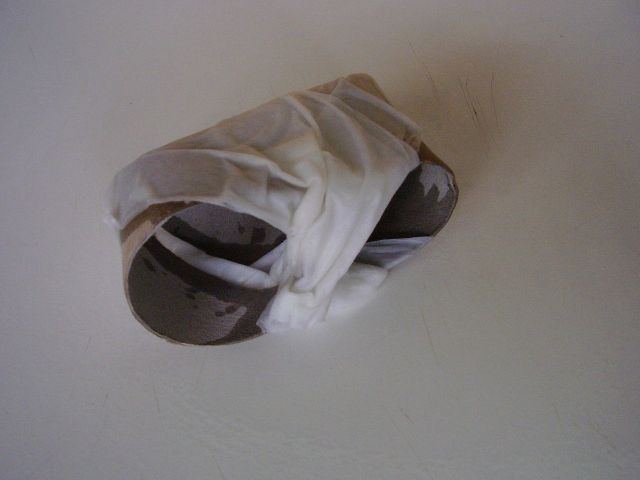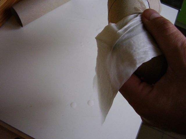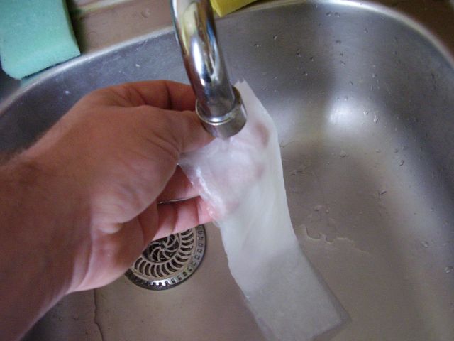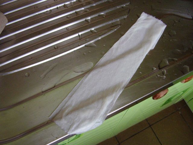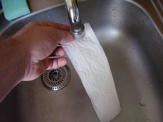 Potom vložíme takýto pásik z utierky pod vodovodný kohútik a prúdom studenej vody ho prevlhčíme. Pod vodou ho však nedržíme priveľmi dlho, najviac 2 - 3 sekundy, lebo mokrý pásik by sa nám vlastnou váhou rýchlo rozpadol. Nakoniec navlhčený pásik položíme na okraj kuchynského drezu a narovnaným ukazovákom prejdeme po ňom zľahka z jedného konca na druhý. Vytlačíme tak z pásika prebytočnú vodu. Na pásik netlačíme príliš moc, aby sme ho pri vytláčaní vody nenatrhli ani vodu nevytláčame postupne tlačením placom na jednotlivé časti pásika. Vytláčanie musí prejsť naraz a pohybom z jedného konca na druhý. Len tak nám voda nebude utekať z jedného kúska pásika do druhého. Stačí si to párkrát vyskúšať a zvládnete to.