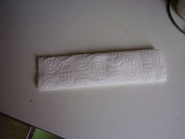 Pri spájaní dielov pomocou papierových utierok postupujeme nasledovne. Zoberieme jeden hárok - jednu utierku a poprekladáme ju do pásika cca 4 až 5 cm širokého.