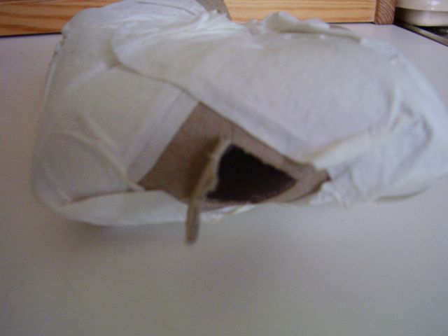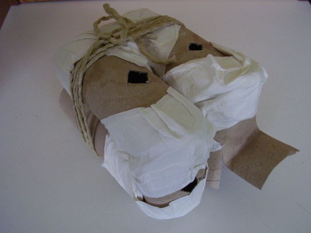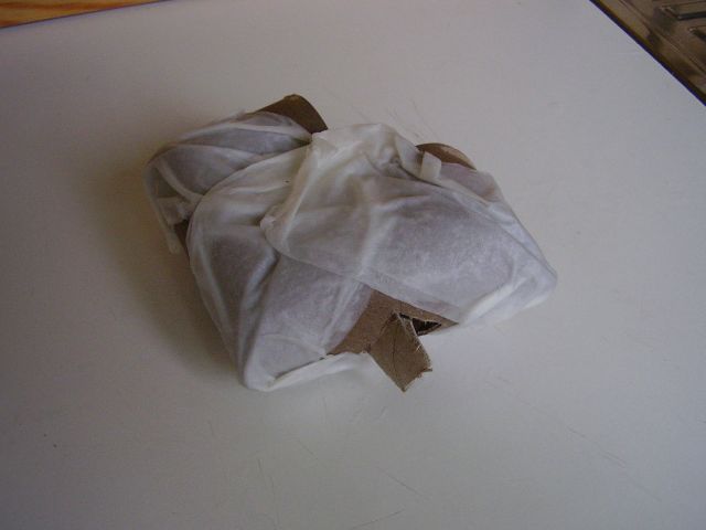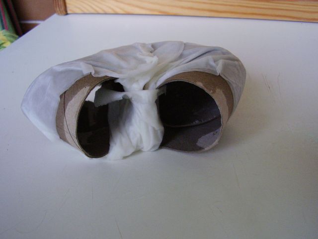 Potom vezmeme dve časti labyrintu, ktoré chceme spojiť v ohybe, priložíme ich v správnej polohe k sebe, jednou rukou ich pridŕžame spolu a druhou položíme namočený pásik utierky jedným koncom na miesto kde majú byť spojené. Palcom ruky na tomto mieste pásik pridržíme a druhou rukou ho opatrne obtáčame rovnomerne okolo celého rozhrania spoju. Pásik pozdĺž celej otáčky okolo spoja jemne pritáčame na časti rúrok, aby sa na ne prilepil. Na treťom obrázku dole vidno, ako takýto "čerstvý" spoj vypadá. Vlhký pásik utierky je rovnomerne priľnutý okolo spoja na oboch rolkách a okraje spoja rolky sú navlhnuté. Takýto spoj necháme na teplom a suchom aspoň 1 až 2 hodiny dobre presnúť. Takto si postupne pripravíme všetky ostatné dvojice - spoje rúrok labyrintu. Predtým, než jednej a tej istej rúrke urobíme druhý spoj, necháme ten prvý dobre preschnúť. Pokiaľ nebude schnúť na aspoň mierne teplom mieste, môže schnutie trvať aj dlhšie. Dobre preschnutý spoj má utierku stvrdnutú a pevnú, tvarom prispôsobenú jednotlivým častiam spoja. Tu treba mať radšej trpezlivosť a nenáhliť sa. Ak začnete na jednej a tej istej rúrke robiť druhý spoj, pokiaľ ten prvý nie je ešte dostatočne preschnutý, môže sa nám celá konštrukcia zdeformovať aj obyčajným jemným tlakom prstov pri obtáčaní vlhkej papierovej rolky okolo druhého spoja, pretože vlhká rúrka z ešte prvého spoja, je nasiaknutá vodou, tažká a veľmi slabá. Týmto spôsobom z jednotlivých častí poskladáme celý labyrint.